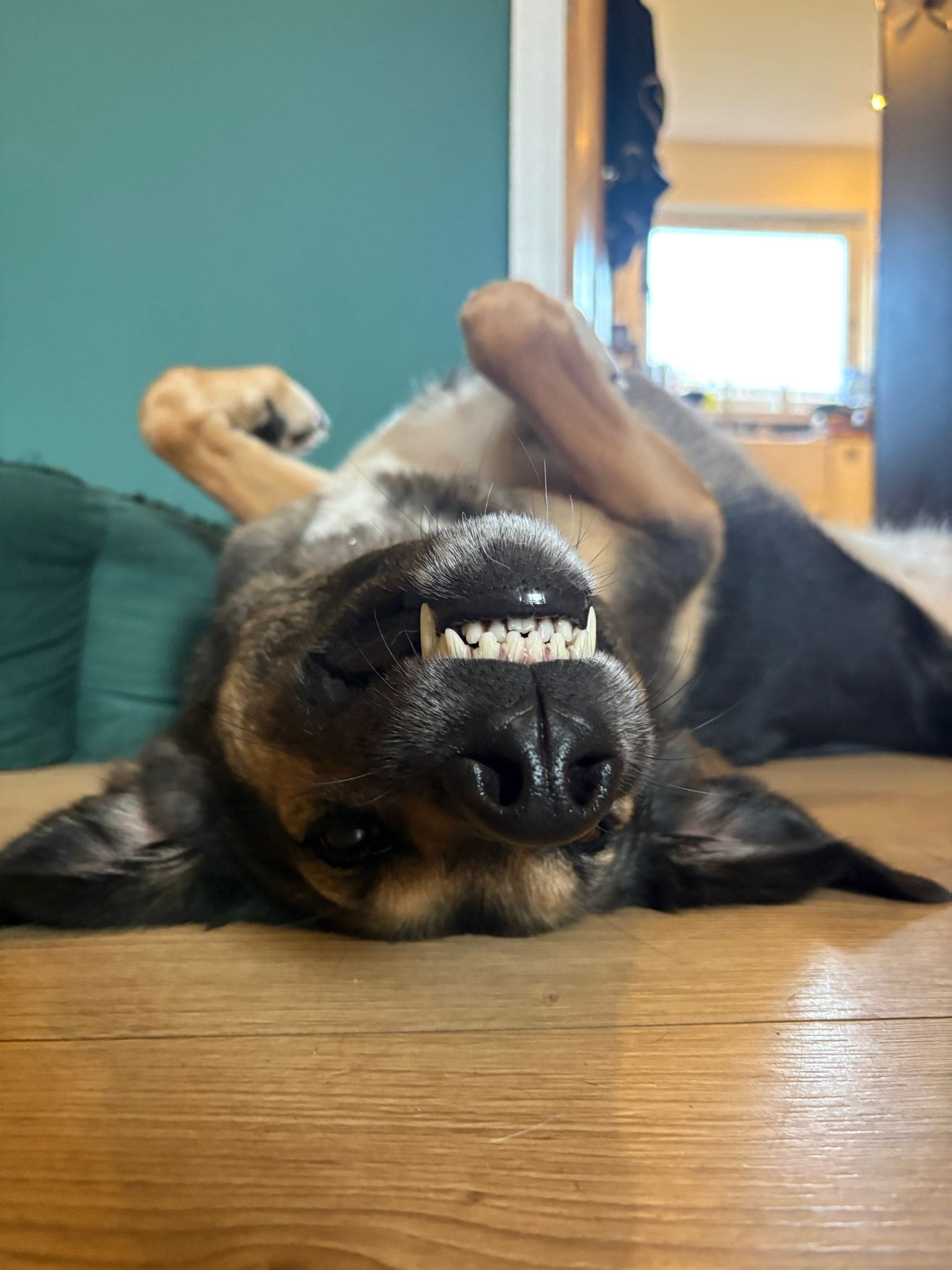 Her reactivity is dog specific, so some dogs she isn’t bothered about at all, but those that she is, she reacts strongly to. Breagha is a Romanian rescue and as with many rescues, she is a nervous girl, so gets a fright from things that move suspiciously like the hoover, or sandwich boards! She can be spooked by people appearing suddenly around a corner for example.