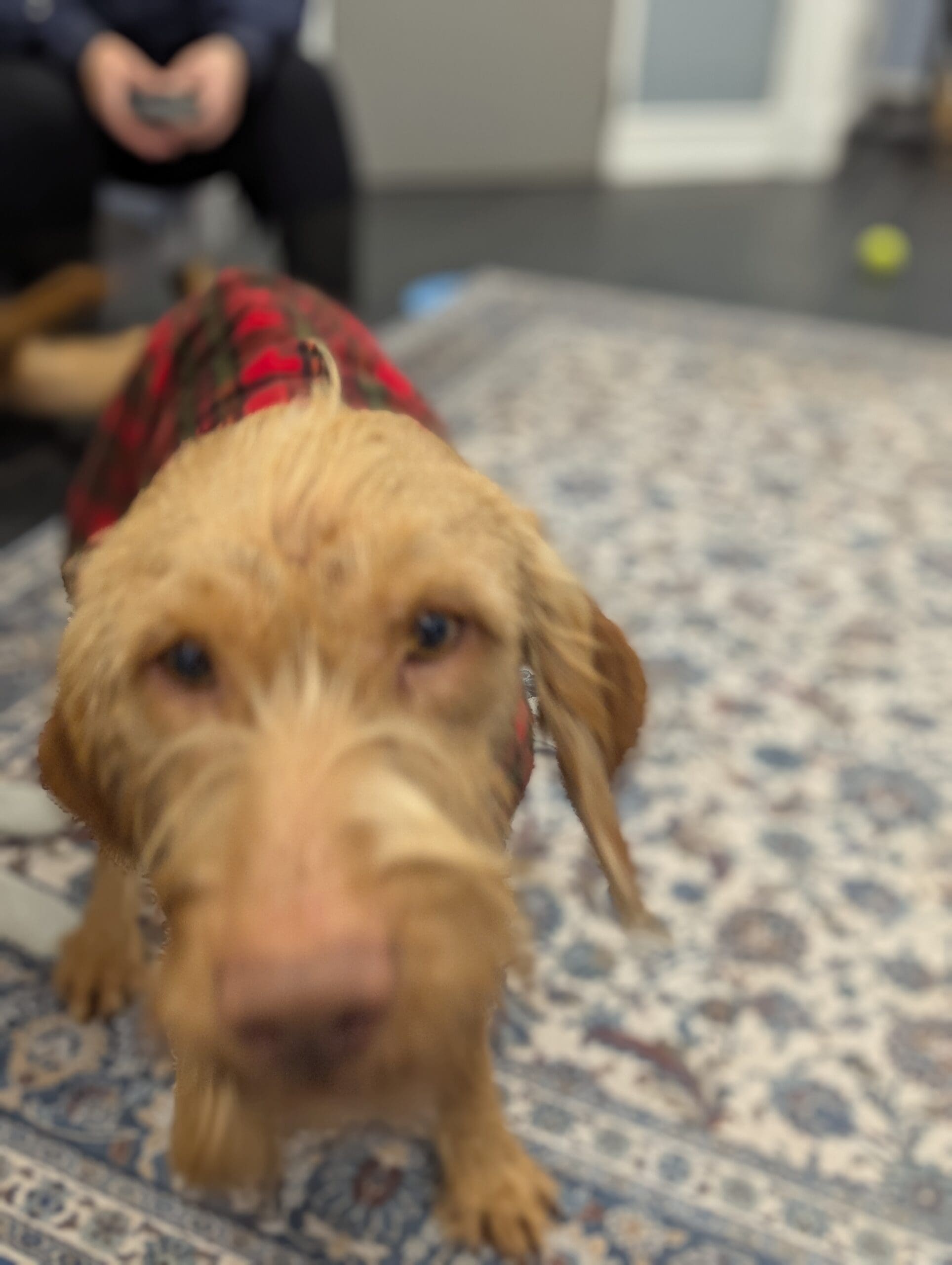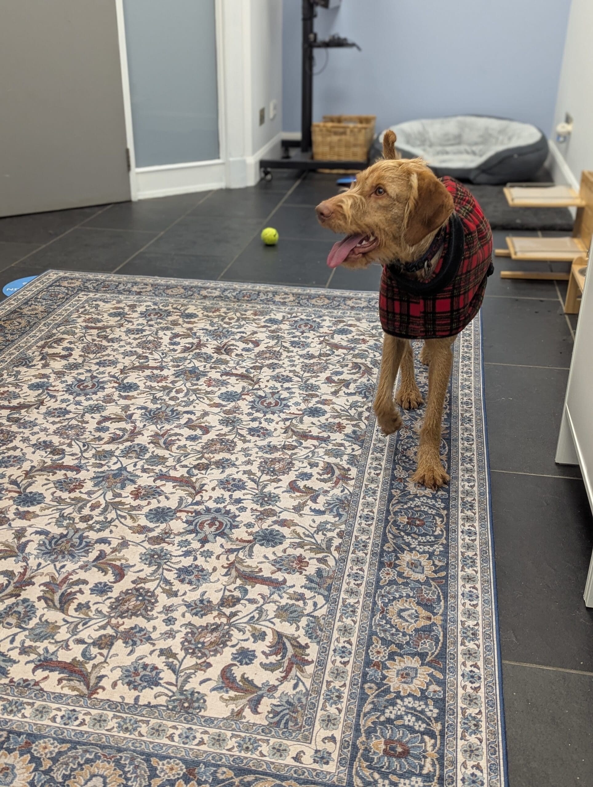 His behaviour is driven by what’s going on with him. He’s really good at playing by himself but does like to play with his doggy friends.