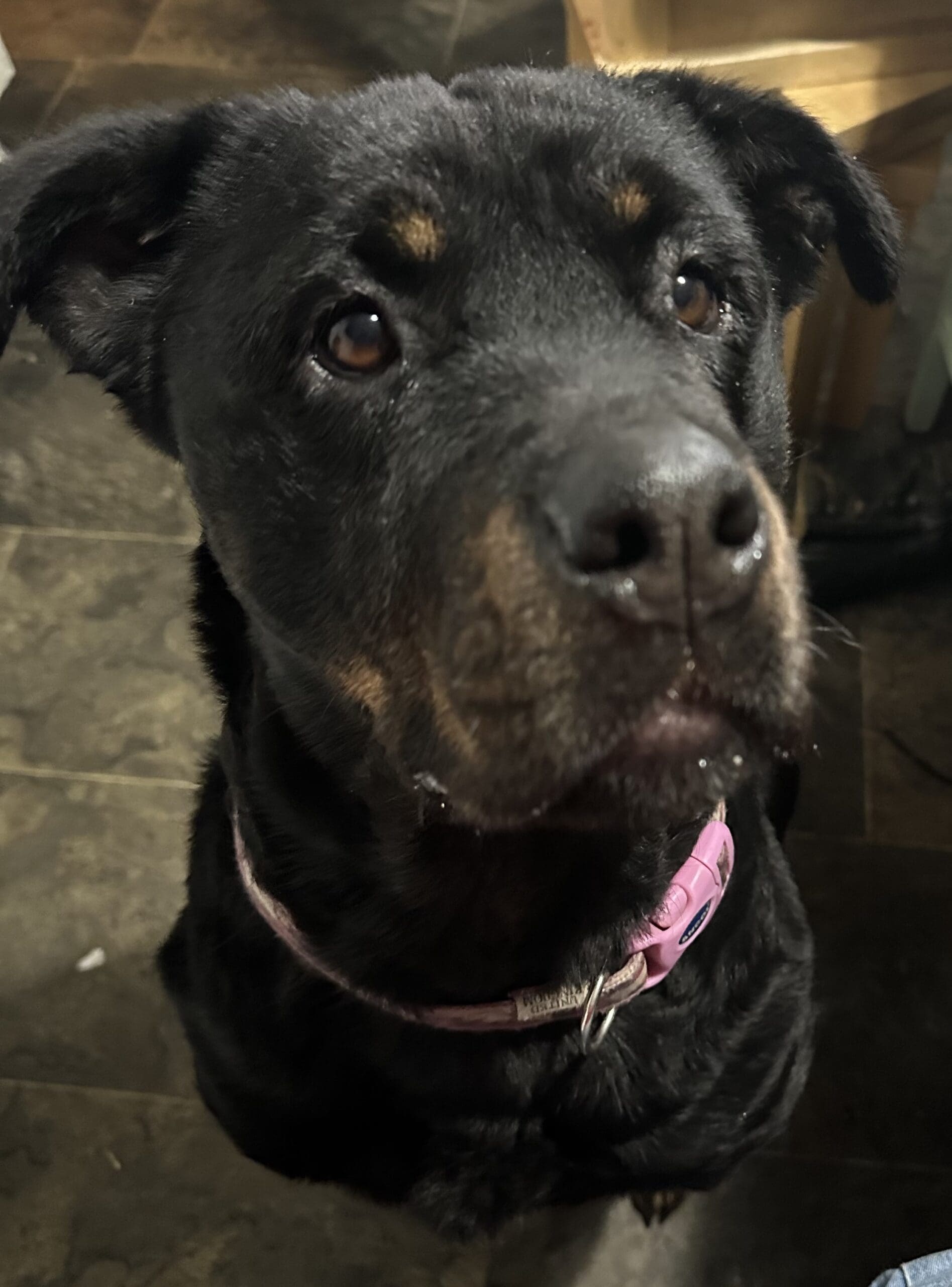 She is very boisterous and can jump up. She would need further triaining on her manners and boundaries.